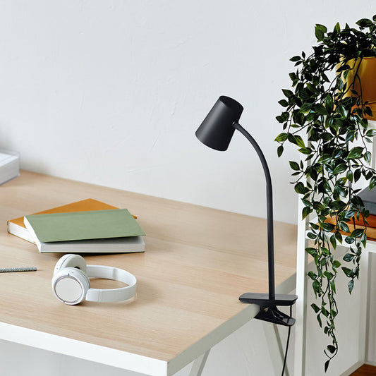Een klemspot met een conische kap, ingebouwde LED, zwanenhalsarm en een dimmerknop op de klem. De maximale klemwijdte is 2,5 cm en de lamp heeft een drietraps dimfunctie.