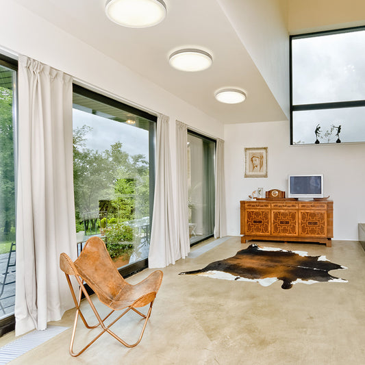 Ronde dimbare plafondlamp met ingebouwde LED, met afstand tot het plafond. De armatuur heeft een ingebouwde schakelaar voor het wijzigen van de kleurtemperatuur van het licht (3000K, 4000K, 6000K). TRIAC dimmen