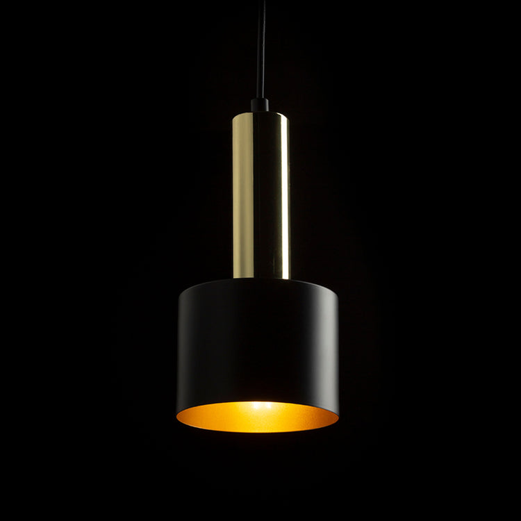 Minimalistische cilindrsiche hanglamp voor GU10 lichtbronnen op ronde basis. Ingebouwde veren in de fitting maken het gebruik van lichtbronnen van verschillende lengtes mogelijk.