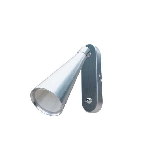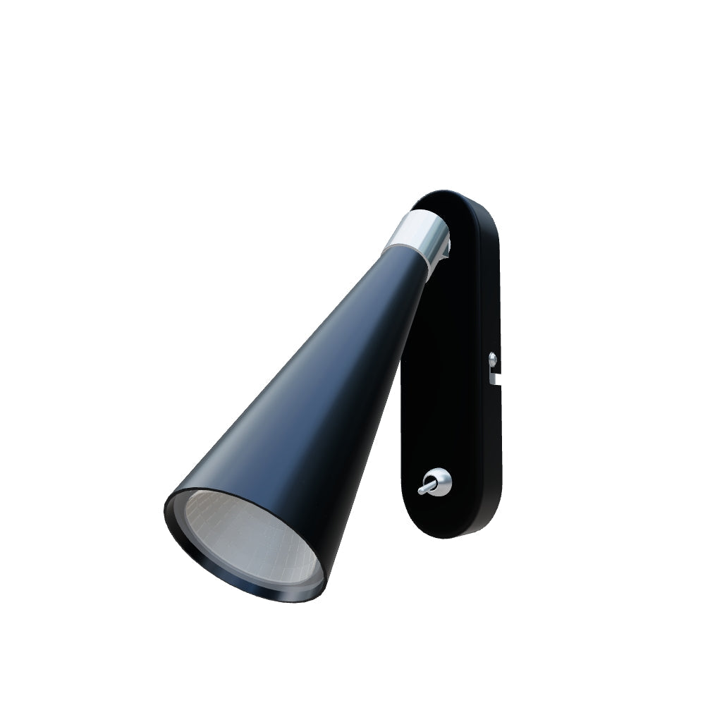 Wandlamp met een conische reflector voor een LED-lamp met een GU10 fitting, voorzien van een tuimelschakelaar op de voet van de armatuur.