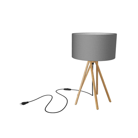 Tafellamp met drievoet standaard van bamboe en lampenkap van textiel. Ongemonteerd verzonden.
