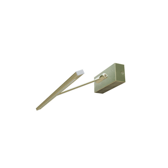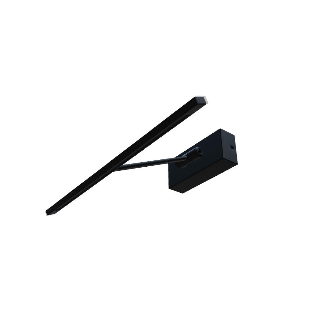 Wandgemonteerde LED-lamp met een verstelbare arm op een verticale as, ideaal voor het verlichten van schilderijen.