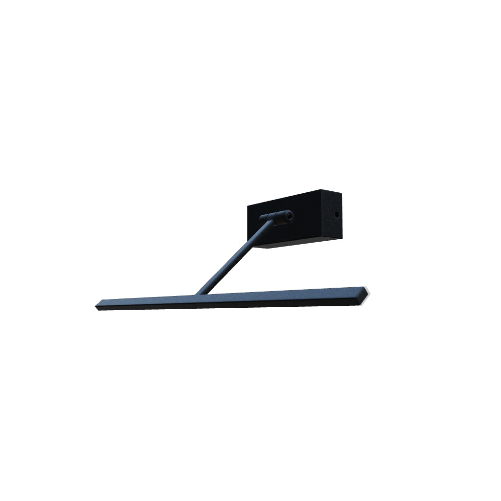 Wandgemonteerde LEDlamp met een verstelbare arm op een verticale as, ideaal voor het verlichten van schilderijen.