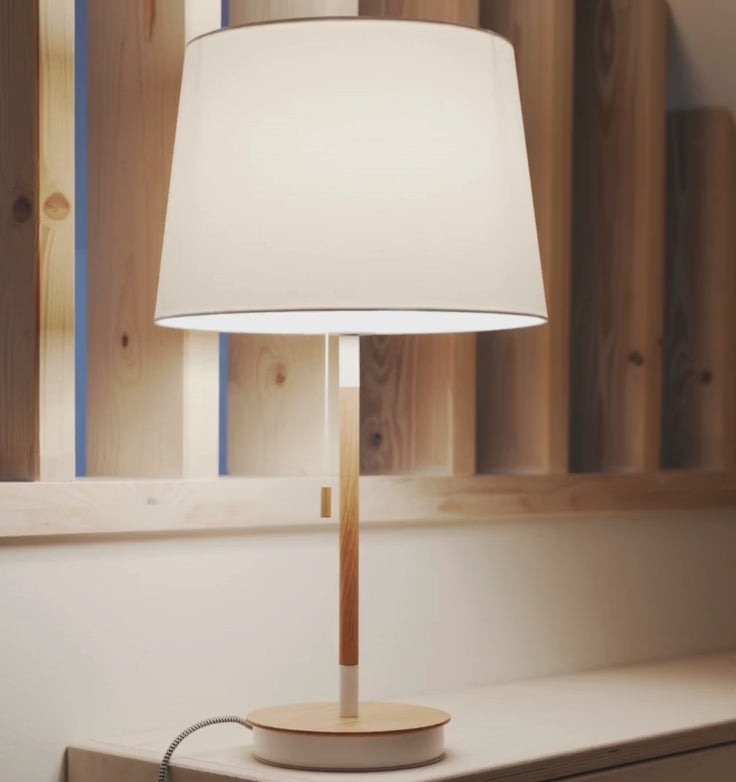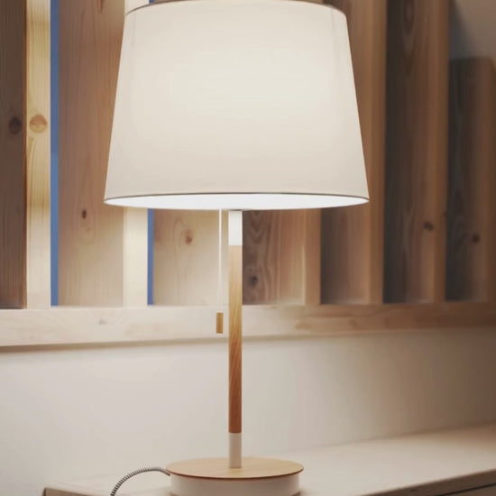 Een tafellamp met een stoffen kap en een USB-poort ingebouwd in de voet. De voet is in imitatiebeuk met wit gelakte details. Geschikt voor LED E27 lichtbronnen.