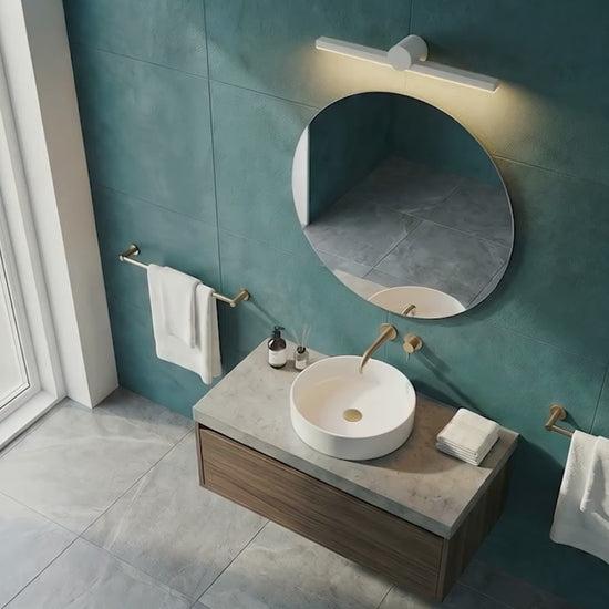 Langwerpige LED lamp met nerrwaartse lichtstroom, geschikt voor gebruik boven spiegels in vochtige ruimtes.