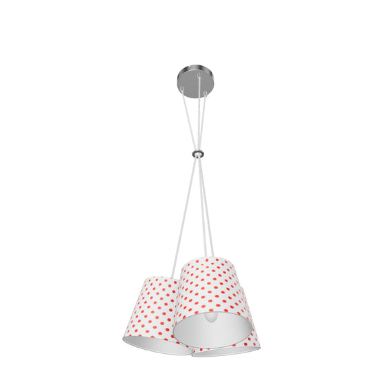 Drie textiel hanglampen op een basis voor 3 lichtbronnen met E14 fitting.