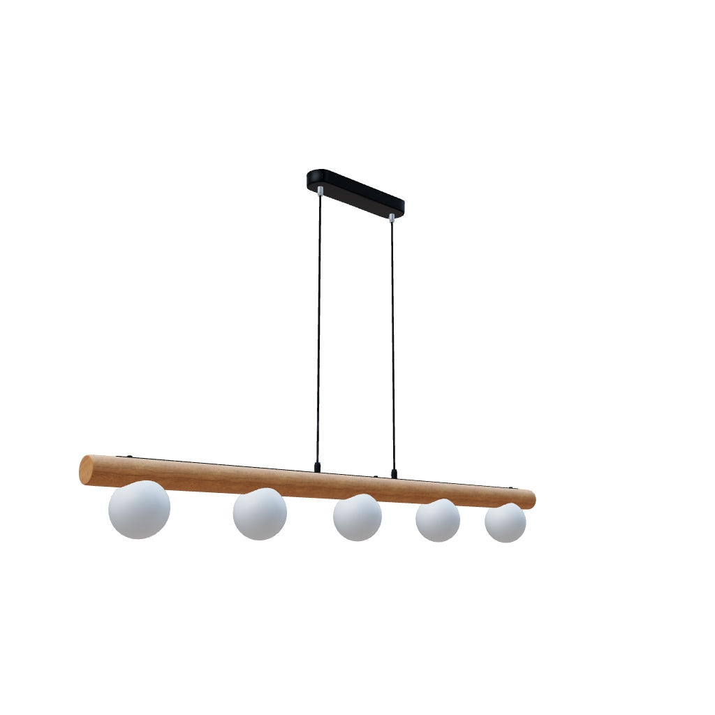 Hanglamp met vijf opaalglazen kappen bevestigd op een houten basis. De plafondplaat is gemaakt van gelakt metaal.
