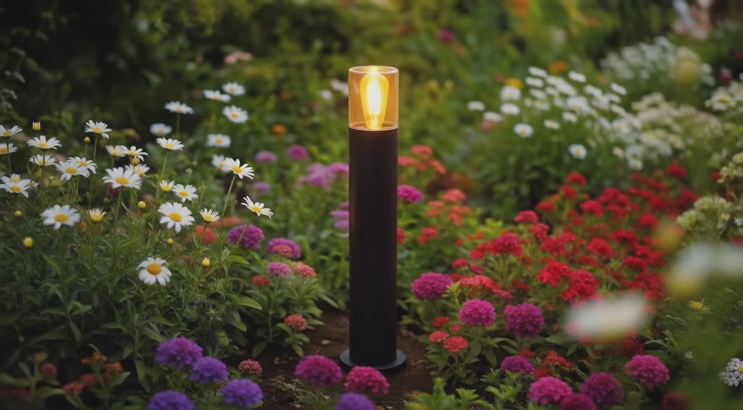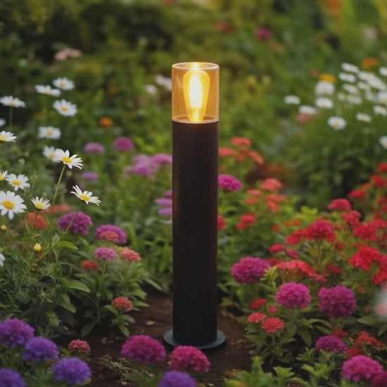 Buiten bolderlamp met amberkleurig glas voor sfeerverlichting, ontworpen voor LED lampen met een E27 fitting.