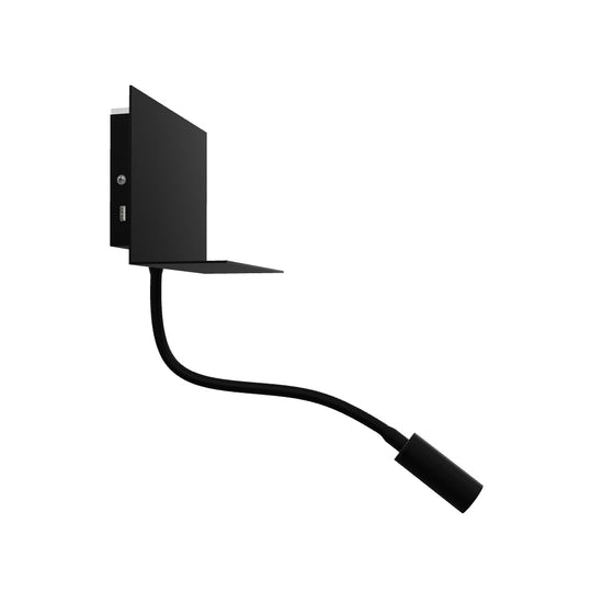 LED wandlamp met oppervlak voor het opladen van smartphones via USB. De LED spotlicht op een zwanenhals en de indirecte lichtbron worden door individuele schakelaars bediend.